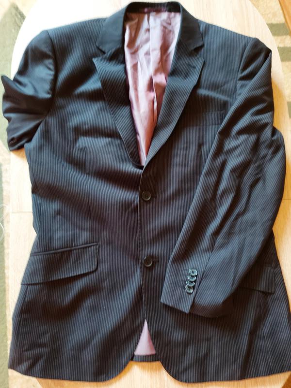 Пиджак. Классическая модель. Цвет чёрный в мелкую серую полоску. Состояние очень хорошее. Состав 70% полиэстера, 30% вискозы. Размер на бирке (фото 8). Замеры ПОГ 53 см, ПО по низу 55 см, длина изделия 78 см, длина рукава 62 см, ширина рукава 19 см. Сзади разрез, 2 кармана (ещё не расшиты), спереди 2 пуговицы, на рукавах по 4 пуговицы.