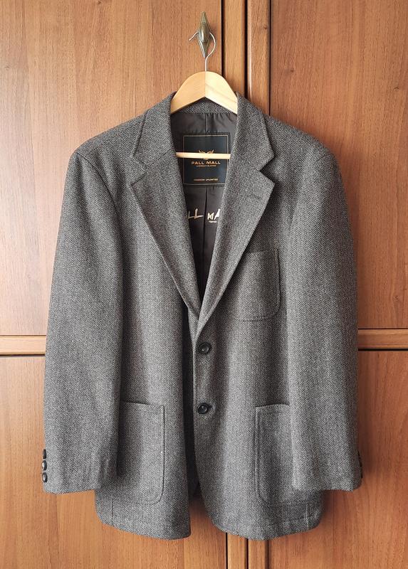 Чоловічий коричневий шерстяний піджак Pall Mall. 60% шерсть, 40% поліестер. Розмір L. Ширина в зоні плечей - 49 см, ширина в зоні грудей - 57 см, довжина ззаду - 77 см, довжина спереду - 80 см, довжина рукава - 63 см.