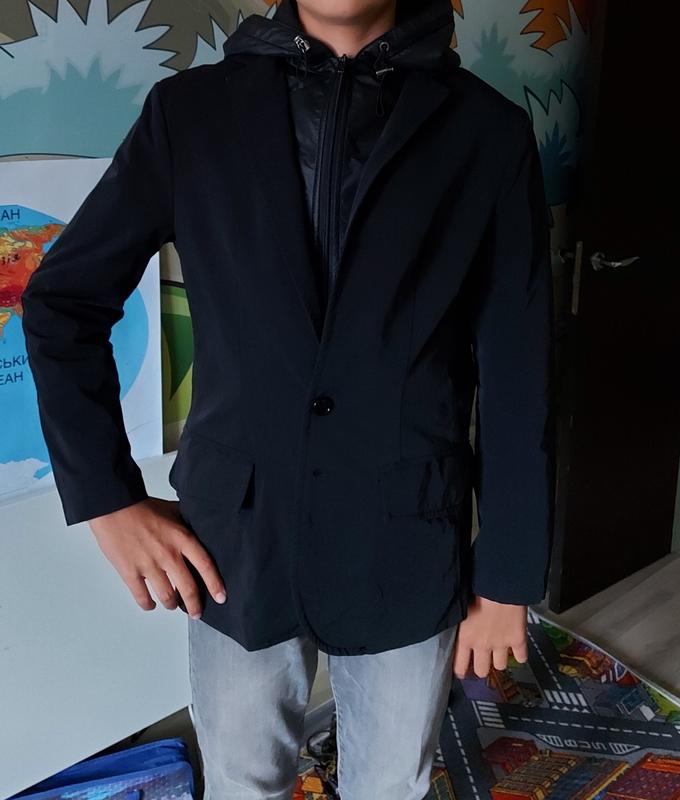 Стильная и оригинальная вещь на ветреную и влажную погоду, пиджак с капюшоном, ткань плащевка, цвет черный. Подойдет для молодого человека на рост до 174 см. Бирки с производителем и составом отсутствуют. Длина 69, рукав 59, плечи 48, ПОГ под рукавами 50, ПОТ 47 см