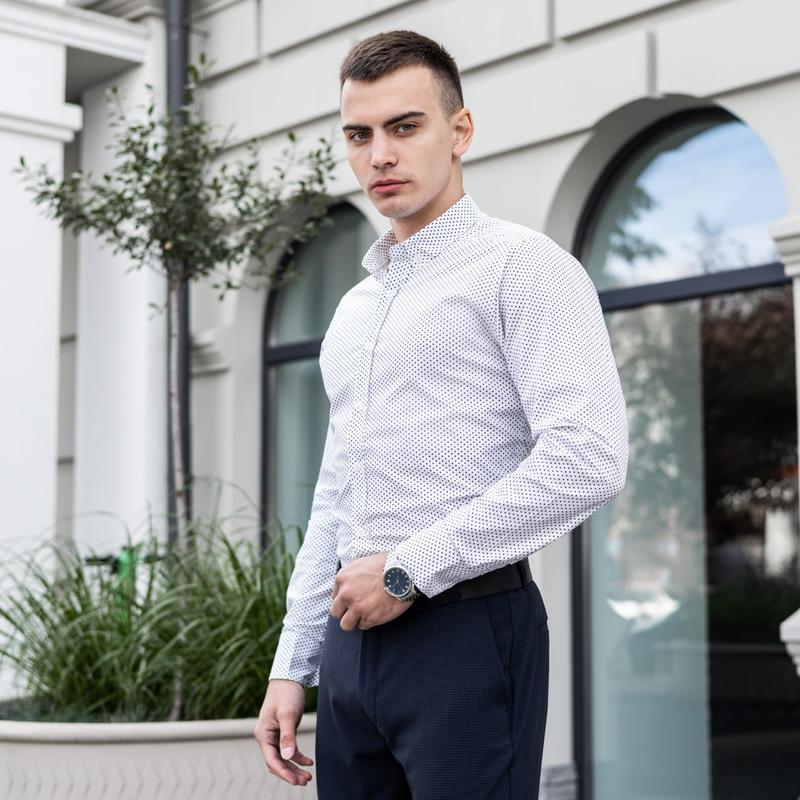 Сорочка Pobedov "Orel" біла в горох ▫️Стильна чоловіча сорочка у дизайні з відкладним коміром та довгим рукавом. ▫️Склад тканини: бавовна -95%, еластан - 5%. ▫️Високоякісний матеріал, через наявність відсотка еластану у складі тканини дозволяє виробу злегка тягнуться, що забезпечує комфорт навіть при щільній посадці, а також допомагає сорочці зберігати початкову форму довгий час. ▫️Комір-відкладний. ▫️Рукав: довгий. ▫️Манжети на ґудзиках. ▫️Застібка: гудзики ▫️Силует: приталений ▫️Розмір: S M L XL XХL