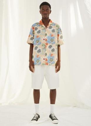 Рубашка свободного кроя из хлопкового плетения с узором. Имеет курортный воротник, французский перед и короткие рукава. Спущенные плечи и подол прямого кроя с разрезами по бокам. Расслабленный крой Состав: Хлопок 100% Длина 72, в груди 56