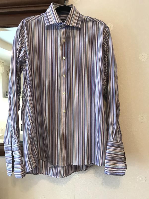 Рубашка мужская Pierre Cardin. В вертикальную полоску- цвета- сиреневый, бежевый, голубой, белый. На стойке воротника- две пуговицы, как на фото. Рукав длинный, манжет с отворотом под запонку. Запонки- в подарок (см. фото). Состав 60% cotton; 40% polyester. Замеры: воротник на этикетке- 41 см.; полуобхват груди- 62 см; длина по спинке- 82 см; длина рукава с манжетом- 61 см; плечо- 17 см; На спинке небольшая затяжка (фото No 5).