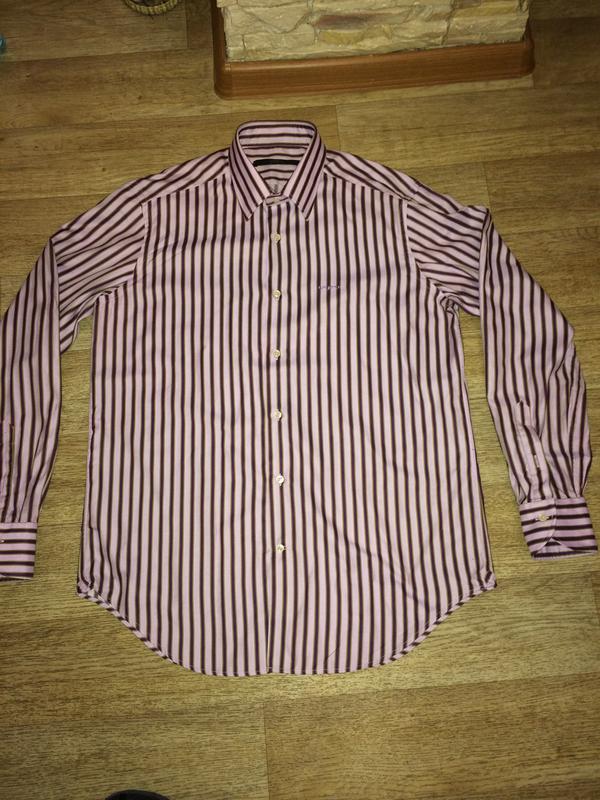 Рубашка в полоску итальянского дизайнера Emanuel Ungaro. Рубашка в идеальном состоянии, как новая. Размер указан 41/16 но подойдёт на М/L. Состав: 100% хлопок. Замеры: подмышки- 57; плечи- 46; длинна- 77; рукав- 64.