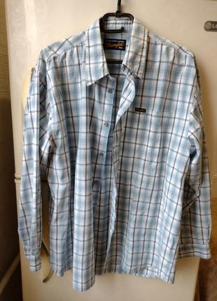Рубашка сорочка Wrangler. 100% коттон. Состояние идеальное,без следов носки. Пуговицы брендированные. Размер указан XXL. ЗАМЕРЫ: ворот-44,ПОГ-65,5-66, плечо-19, плечи по спинке-53, длина по спинке-79, рукав-60,внутренний шов-48.