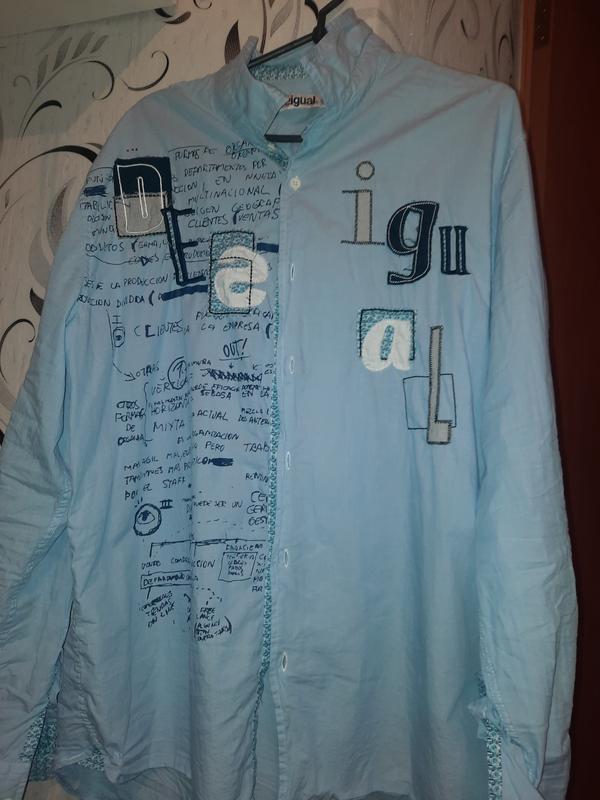 Рубашка мужская, размер XXL, в идеальном состоянии голубого цвета с принтом надписи