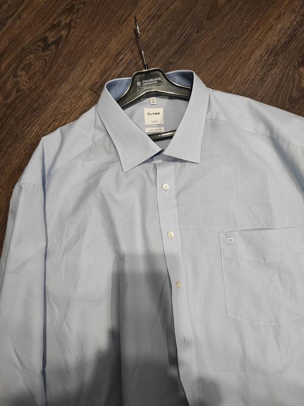 Рубашка Olymp(сток). Размер указан 19(4XL), по вороту 48(56), реально подойдет на 54-56-58, но лучше ориентируйтесь на замеры. Состав ткани 100% хлопок. Замеры: плечи 58 см, от подмышки до подмышки 75 см, длина рукава 65 см, длина рубашки 90 см. Состояние идеальное(новой вещи). Дефектов и нюансов нет.