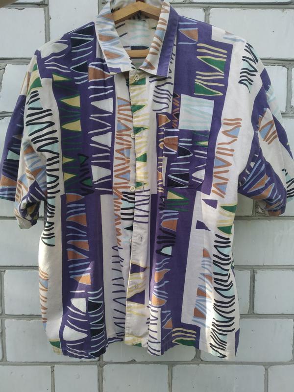 мужская абстрактная короткая рубашка очень крутая гамма цветов размер M но она широкая в тела состояние очень хорошее
