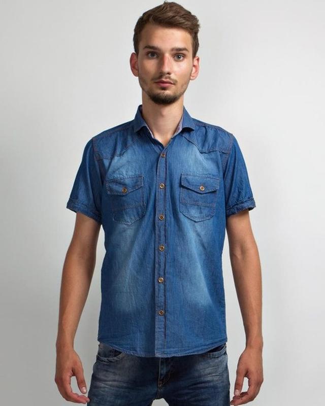 Синяя мужская джинсовая рубашка Demate MH150 на короткий рукав. Окраска выварка, есть два верхних кармана.