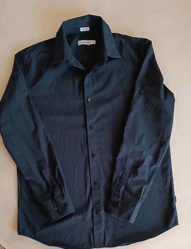 мужская рубашка черного цвета в темно-серую мелкую полоску от Calvin Klein. Размер М, возможно на небольшую L. Замеры: -общая длина по спине без воротника 76см -плечи 43см -полуобхват под руками 56см -длина рукава 64см -расстояние воротник-плече 15см. Гудзики брендированные, есть два запасных, на манжетах по две пуговицы, можно фиксировать объем запястья (см. последнее фото). Ткань качественная, коттон 100%, приятная на ощупь.