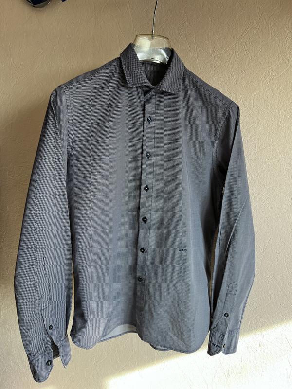 Красива мужская рубашка марки Gas. Синяя, состав хлопок. Состояние идеальное. Плечи-46 Под рукавами-53 Рукава-67 Длина-72