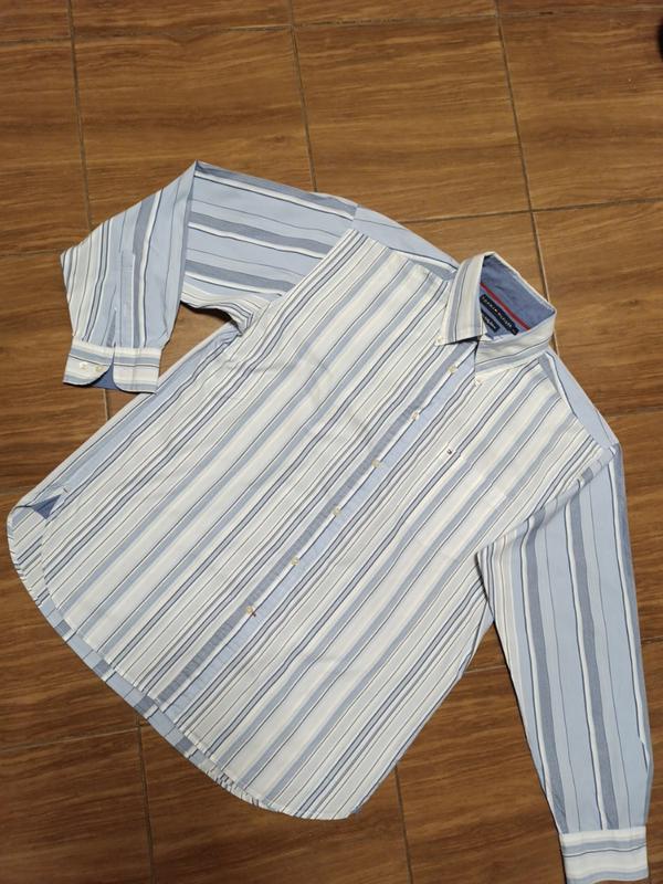 Мужская рубашка в полоску от Hilfiger. Размер L. Замер: плечи 53см, пог 63см, длина 79см, рукав 60см, бицепс 25см, воротник 41см.
