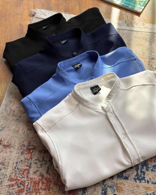 ▫️Материал: костюмная ткань (50%viscose, 40%polyester, 10% elastan). ▫️Цвета: черный, темно-синий, молочный, голубой. ▫️Рубашка застегивается с помощью пуговиц. ▫️Воротник - стойка. ▫️Манжеты рукавов на пуговицах. ▫️В комплекте идет дополнительная пуговица. ▫️Сезон: весна/осень. ❗К рубашке есть также брюки, чтобы образ был закончен❗