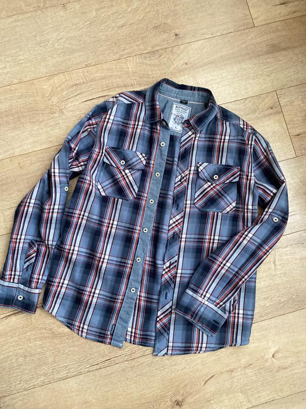 Сорочка чоловіча на ґудзики, на довгий рукав, який можна закручувати і фіксувати на короткий, тканина тонка 100% котону. Стан дуже гарний, але колір більш насичений ніж на яву. Насправді колір більш приглушений і відповідає фото з окремими деталями. Заміри: спина 43 см, довжина 66 см, ПОГ 49 см, рукав по верху 60см, по низу 47 см, обхват комірця 39 см. Розмір L але мабуть підлітковий, або ж М