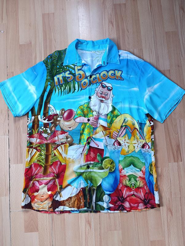 Забавная мужская летняя гавайская рубашка. Стан идеален.Ткань легкая и приятная.Берка щу составом отсутствует. Полуобхват груди 65 см Полу обхват талии 62 см Длина 80 см плечевой шов 19 см Рукав 26,5 см Размер XXL