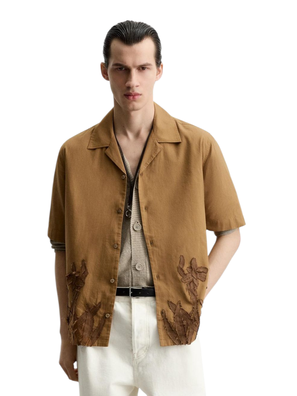 Рубашка мужская с коротким рукавом Zara, коричневая, декорирована аппликацией, застегивается на пуговицы. Нова. Размер L, подойдет на М.
