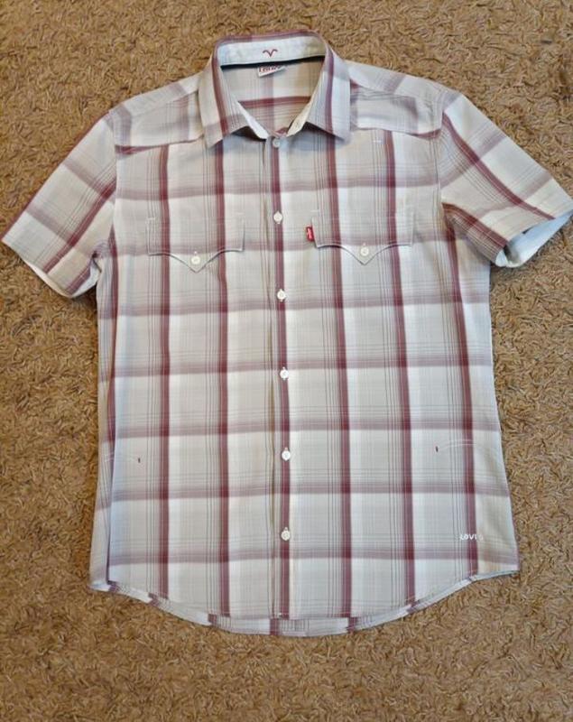 Рубашка мужская Levi's (ориг). Модель прямого классического кроя, с коротким рукавом, нагрудные накладные карманы, фирменный красный логотип-нашивка сбоку кармана, снизу вышивка бежевого цвета с надписью бренда. Гудзики брендовые - Levi's. Принт в бежево-бордовой палитре. Полоска Драконane. Размер - L. Длина - 73 см. Ширина плеча (по спинці) - 45 см. Объем под руками - 110 см. Длина рукава - 23 см. Объем воротничка - 45 см. Тканина - бавовна (100%). Состояние отлично - без нюансов и характерных признаков ношения (воротник, под руками, зона подмышек, т.е. - идеальны).