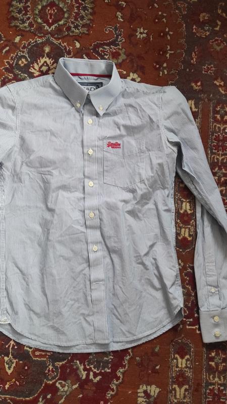 Мужская рубашка Superdry с длинным рукавом. Воротник на пуговицах (button-down). Один нагрудный карман с вышитым красным логотипом бренда. Закругленный нижний край. Материал: 100% хлопок с мягкой отделкой. размер М, плечи44, рукав74, пот под мышками52, пояс49, длина66