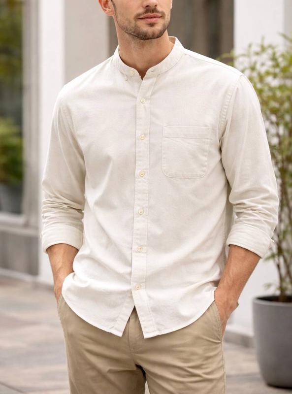 Базовая рубашка с круглым воротником stand colar от бренда Uniqlo, состояние идеальное. Материал мягкий фланель, 100% хлопок. Нежный цвет сливочного масла. Размер М