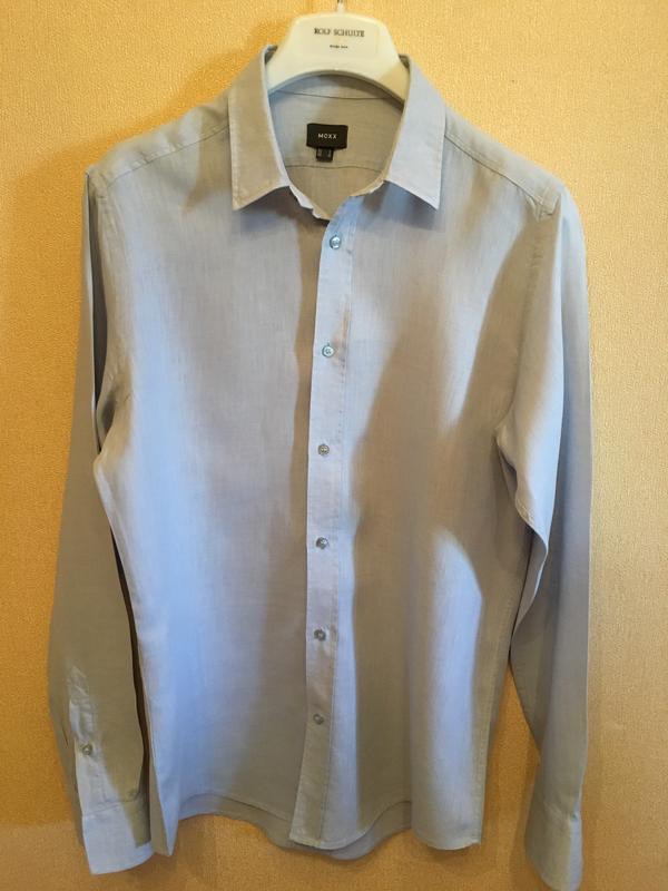 Розмір на бірці L, заміри: довжина 80, ПОГ ширина 54, плечі 45, рукав 68, низ 54, трохи приталина ( фото 4,5) ПІТ 50см. Світло - блакитний з сірим колір, 👍 планка по спинці ( фото 3,6) , лого бренду на рукаві ( фото 10) . Наявність 2 запасних гудзиків. Стан абсолютно нової речі ( фото 7,8) .