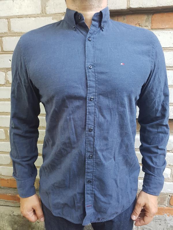 Стильная хлопковая рубашка Tommy Hilfiger приятного синего цвета. Отлично садится по фигуре, отлично сочетается и с джинсами, и с брюками. Замеры: полуобхват груди 55, плечи 46,5 см, длина по спине от воротника 80 см.