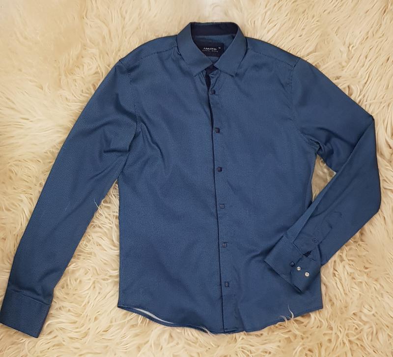 Рубашка мужская, новая, только примерялась. Очень красивый, модный цвет-синий с бирюзой. Дорого смотрится. Красиво и в незаправленном виде, и заправить можно в брюки. Застегивается на кнопки. Размер М Состав на фото. Замеры: Плечи 41 см Рукав 64,5 см Подмышки 51 см Длина 62 см