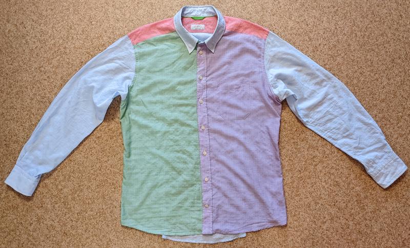Рубашка Eton, минимальное б/у (самостоятельно сделаны вытачки на спине, см. фото, внесенные изменения изделие не портят, отлично подчеркнут фигуру), размер 43/ХЛ, материал очень тонкий хлопок с добавлением 5% полиэстера . Комбинация голубого, зеленого, сиреневого и кораллового цветов. Замеры плечи -50 см подмышками - 60 см длина 76 см рукав- 66 см