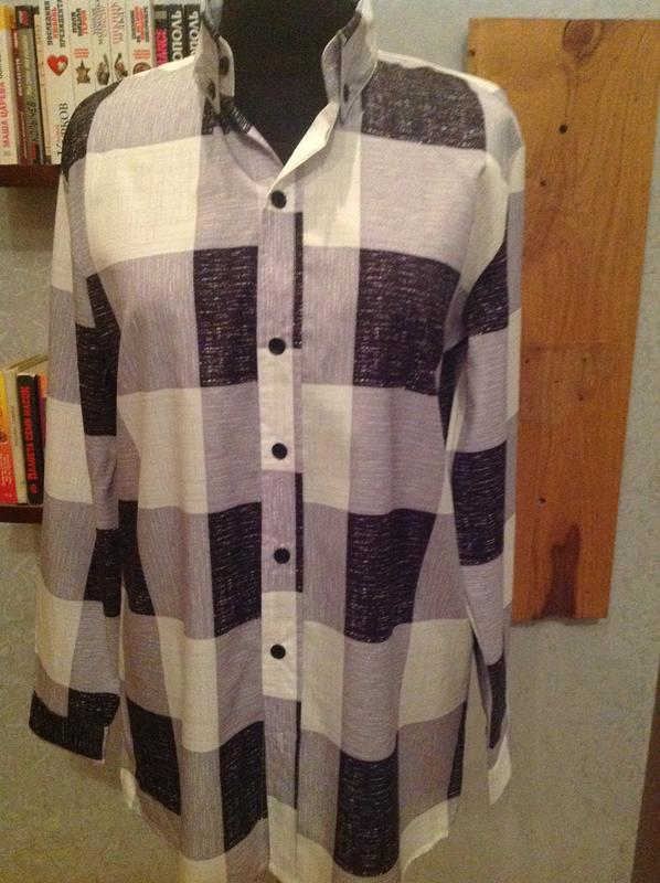 Рубашка р. 50-52 Состав: 65% полиэстер, 35% спандекс Мерочки: ПОГ 55см, ПОТ 53,5см, рукав 61см, в плечах 48см, длина по спинке 77см. Мягкая, струящаяся, приятная к телу ткань. Цветовая гамма: серо-черно-белая. Не мнётся.