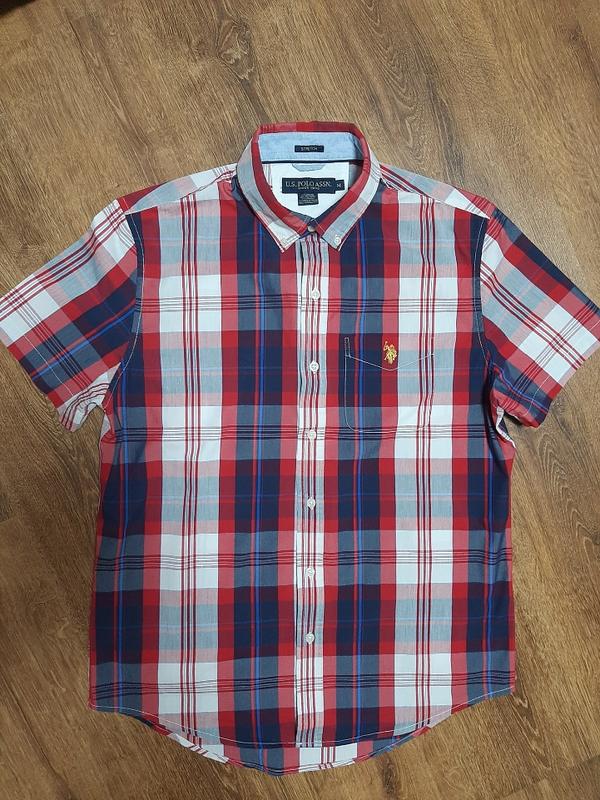 Красивая тенниска в сине-красную клетку. Размер М. Замер : плечи 45см, пог 59см, длина по спине 80см, рукав 22см, воротник 40см. Ткань коттон 66%, полиэстер 30%, спандекс 4%.