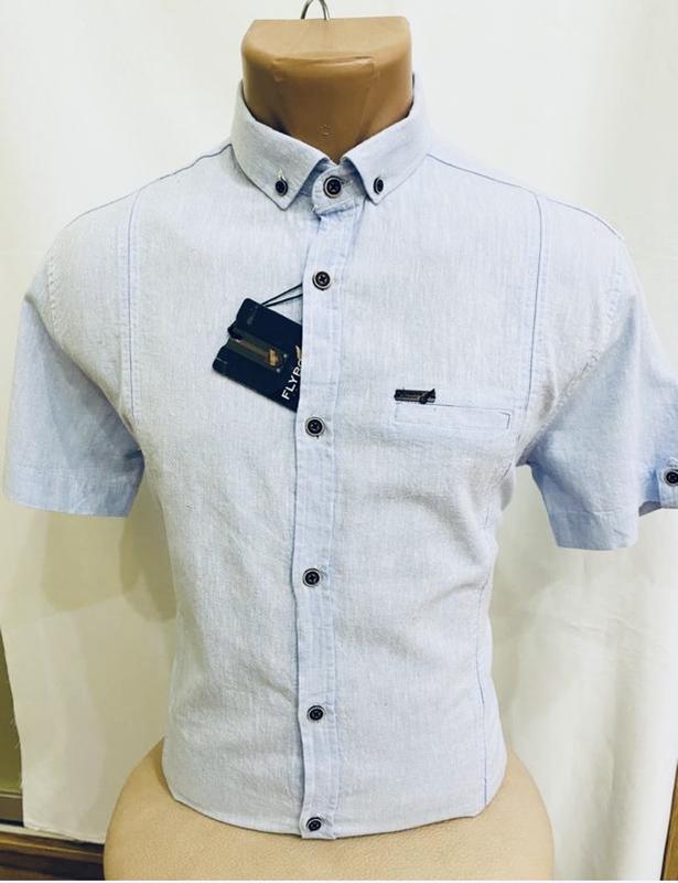 Однотонная рубашка голубого цвета с коротким рукавом, от высококачественного турецкого производителя FlyBoys. Рубашка приталенного кроя, имеет воротник с пуговицами, карман-обманку и полностью застегивается на красивой пуговице. Мягкая, хорошо носится ткань, не выгорает на солнце, не электризуется. :S-пог48,пот46 М-пог53,пот50,5 Xl-пон56,5,пот-54