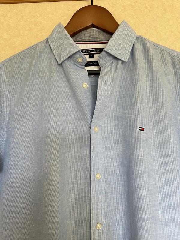 Тоненька та легка теніска блакитного кольору у тоненьку смужку від Tommy Hilfiger. В складі 62%~бавовна та 38%~льон. Стан ідеальний, без нюансів. Розмір М.