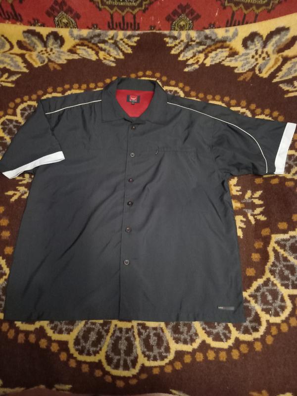 Теніска чоловіча, великого розміру, з тканини, яка нагадує тонку плащівку, але не важка, а легка на вагу. Тканина мікрополіестр, не тягнеться і довго носиться.Є карман на грудях, застібаються на молнії. ФУРНІТУРА ОРИГІНАЛУ. РОЗМІР XXL. Заміри : Пог 68см, Пот 67см, Поб 67см, плечі 62см, довжина рукава від плеча 29см, довжина по спині 80см. Б/у в ідеальному стані без дефектів