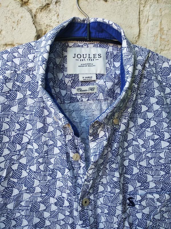 Летняя рубашка с короткими рукавами из воздушного хлопка. Украшена массой веселых рыбок, имеющих много полезных символичных значений. Практичный синий воротничок, интересные детали. Знаменитый зайчик на кармане.