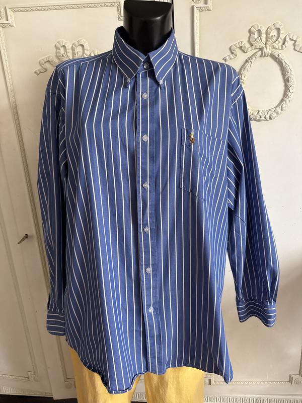 Якісна чоловіча сорочка в смужку:синій/білий колір. Розмір по бірці-XL. Заміри: довжина по спинці-82 см, ПОГ-62 см, ПОБ-62 см, рукав від ворота-78 см. Стан ідеальний.