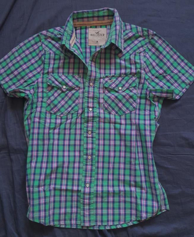 новая/не одевалась/стан новой вещи М длина по спине 67 ширина по плечах 40-41 -по груди 106 -по таліі 96 мужская повседневная рубашка с коротким рукавом от бренда Hollister Co.. Модель выполнена в стиле «вестерн» и украшена ярким клетчатым узором (тартаном) в зеленой, фиолетовой и синей цветовой гамме.