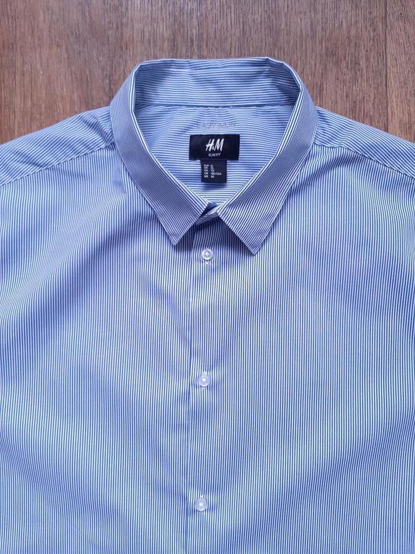 Теніска в біло-блакитну смужку H&M Slim fit вказаний розмір xl ,але може підійти і на L. Приталені. Більш детально виміри вказані нижче. Матеріал-35% бавовна, 65% поліестер. Гудзики прозорі. Стан ідеальний. Вад немає. У використанні не була. Зручна, стильна. Відмінний вибір для дозвілля, роботи в офісі та інших заходів. Заміри: напівобхват по грудях-61 см напівобхват по талії-56 см висота (від низу коміра до низу теніски)-81 см плечі-50,5 см ширина рукава біля краю - 20 см
