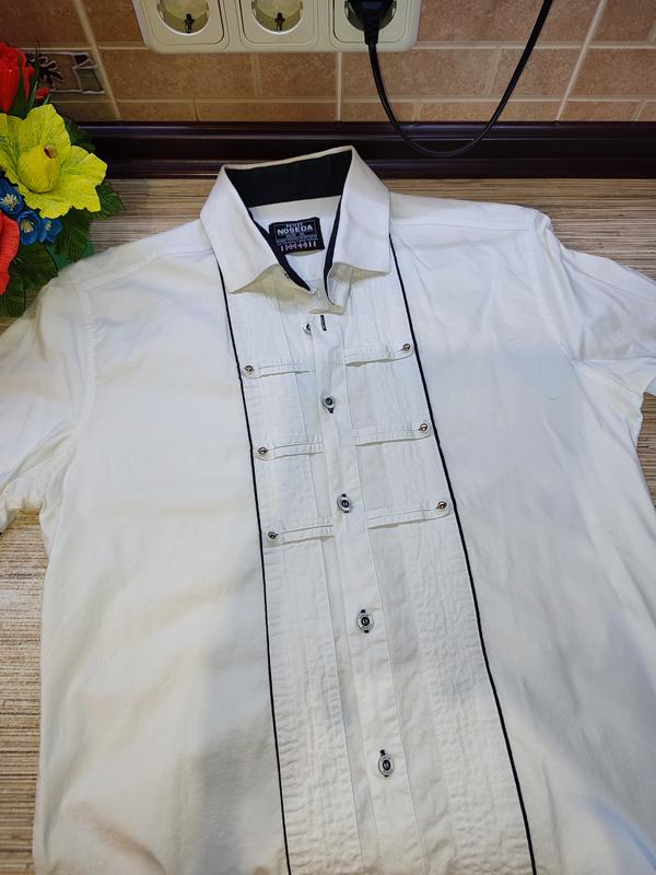 Біла чоловіча теніска, дуже цікава, нарядна, приталена, тканина тягнеться. По бірці XL, але маломврить. Стан відмінний, але є фабричний дефект (останнє фото) довжина 70 плечі 44 під руками 48 талія 45