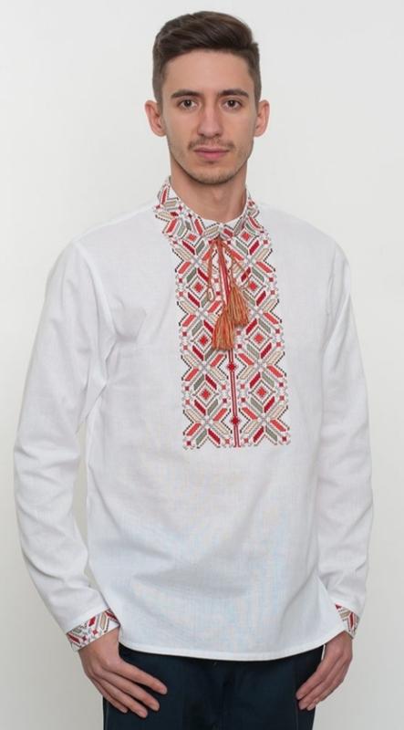 Красива чоловіча сорочка-вишиванка з довгим рукавом. Комір стійкою, на зав’язках з китицями, з вишивкою в тон основному малюнку на передній частині сорочки. Довгий рукав з вишитими манжетами на застібці. Поділ рівний, з розпірками з боків, без вишивки. Це дозволяє носити сорочку як навипуск, так і заправленою в штани. Спинка однотонна, біла. розміри 42-60