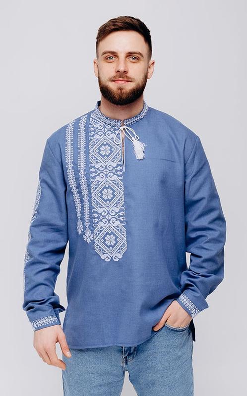 Мужская вышиванка синего цвета с геометрическим орнаментом. Материал - 60% хлопок, 40% полиэстер. Вышивка – машинная. Узор вертикально расположен по одной стороне рубашки, что придает вышиванке особый современный стиль.
