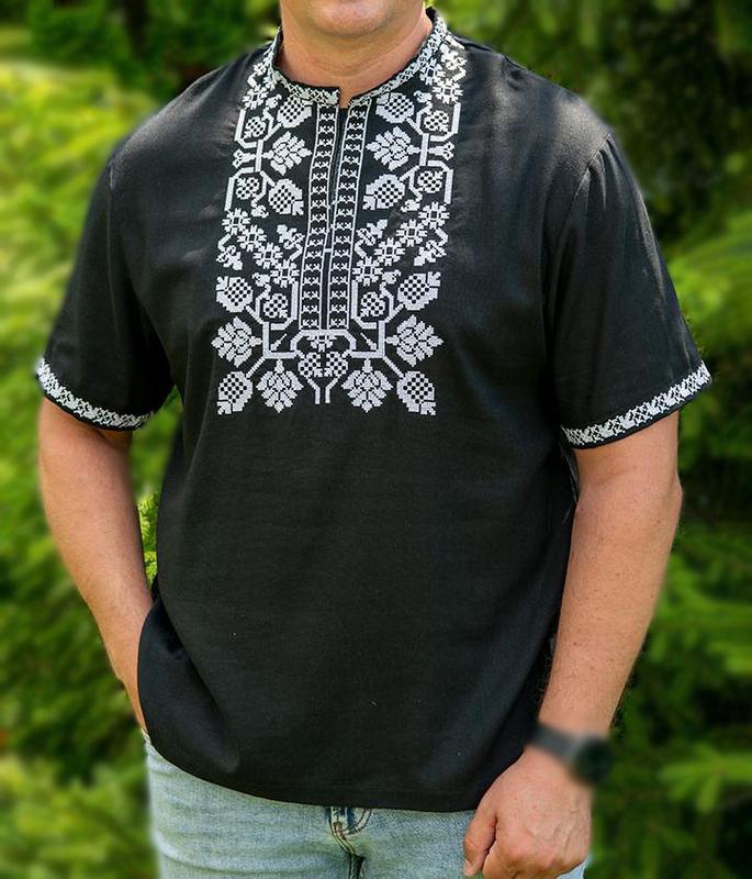 Чоловіча вишиванка льон короткий рукав. красива чорна вишиванка льон.