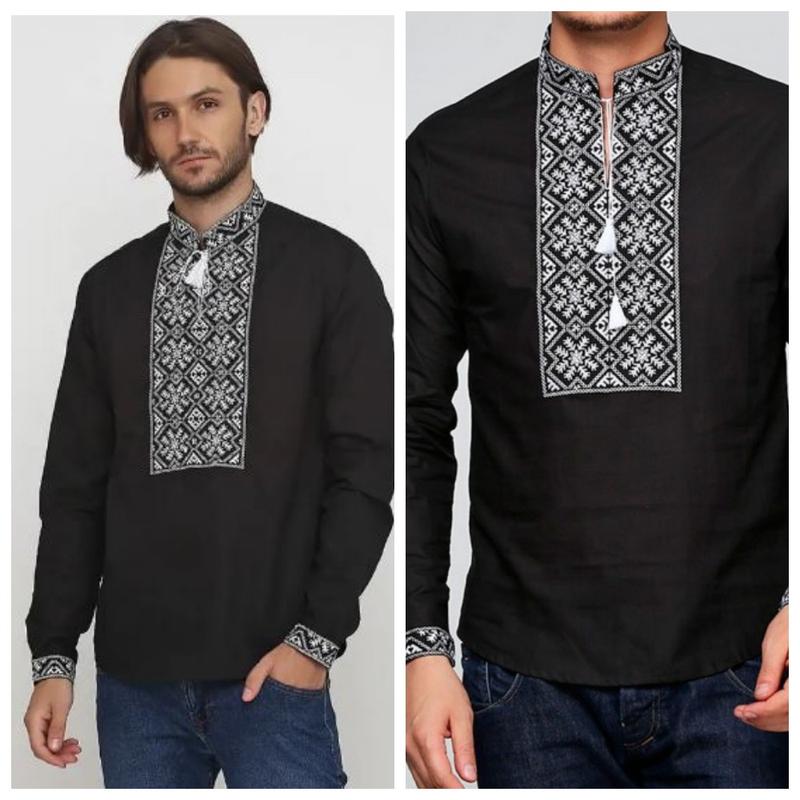 Чоловіча лляна чорна вишиванка з білою вишивкою, розміри 46 - 54