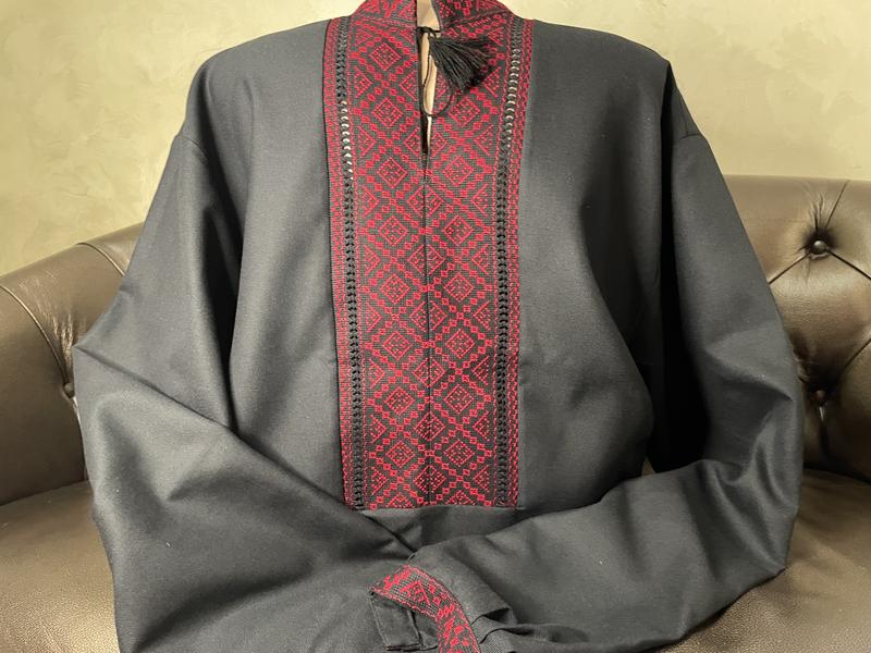 Стильна чоловіча вишиванка на чорному домотканому полотні ручної роботи. ч-1592