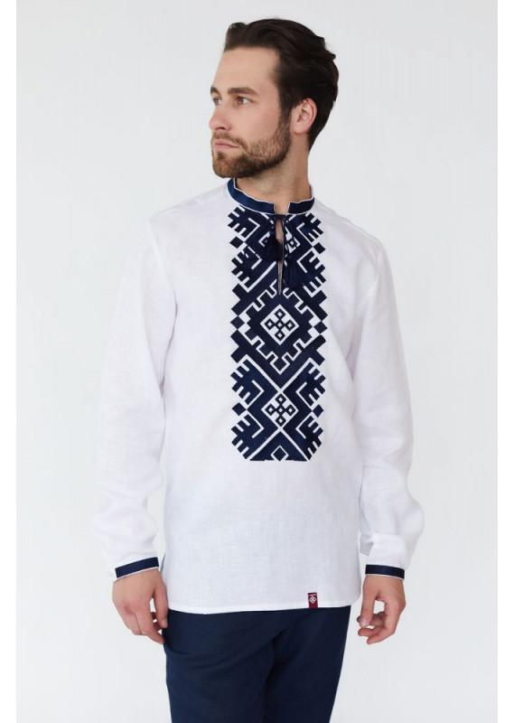 Льняная белая вышиванка в сочетании с синим орнаментом смотрится чрезвычайно эффектно. Универсальные цвета и классический узор подойдет для официальной встречи или вечеринки. Данная модель подойдет как молодым, так и уже солидным мужчинам. Вышиванка свободного кроя выполнена по мотивам гускульского орнамента. Вышивка создана в один цвет на контрасте с тканью рубашки. Техника исполнения орнамента - гладь. Особенностью данной модели являются удобные завязки-угусасики и деревянные пуговицы на манжетах. Натуральная ткань обеспечивает комфорт, удобство и уют в любую погоду. Таким образом, надев эту рубашку летом или в холодное время года вы будете выглядеть красиво и уместно.