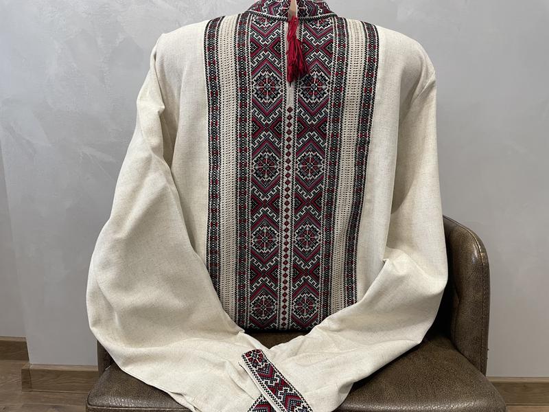 Стильна чоловіча вишиванка ручної роботи на сірому льоні. ч-2137