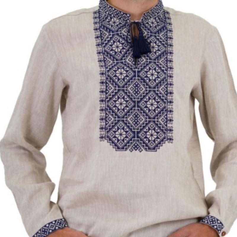 Вышиванка мужская, 100% натуральная льняная ткань, бежевого цвета с темно-синей вышивкой, длинный рукав, манжет и воротник с вышивкой. Размер XXL, рост 182. Обхват груди 108-110 см, обхват шеи 43см.