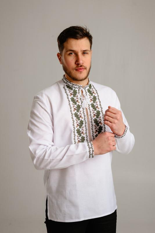 Вышитая мужская рубашка в белом цвете с узором в виде дубовых листьев и желудей. Узор размещен на груди и манжетах. Воротник стойкой, горловина с завязками.