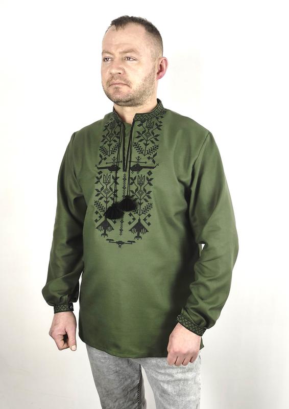Чоловіча вишиванка хакі на довгий рукав Вишиванки власного виробництва є опт і роздріб Характеристики чоловічої вишиванки: Сорочка доросла вишита Рукав - довгий розмір євро 42-54 Орнамент - Військовий тканина - Домоткане полотно При вишивані виробу на спід тканини підкладається папір, для якісного вишивання, який після прання відмокає та легко відчищається. Папір також є гарантом що вишиванка нова. Параметри виробів можуть відрізнятись 1-2 см Вибираючи розмір орієнтуйтесь по розмірній таблиці, рекомендовано: обхват – грудей має бути в виробі на 3-5 см більшим ніж обхват тіла.. При відсутності товару пошив його займе 1-4 днів