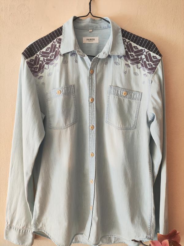 красивая рубашка с вышивкой в новом состоянии. 10 из 10. сделана из 100%котона,ткань напоминает облегченный джинс. прекрасная альтернатива вышиванца, в жизни смотрит намного красивее. размер Л, но лучше на мой взгляд на М. сток. Длина 72 Ширина 52,5 Плечи48 Рукав66, 5 Рукав от горловины 83,5 Пишайте на мою страницу, будет много новинок по хорошей цене.