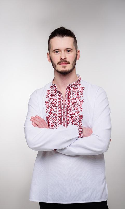 Вышитая мужская рубашка в белом цвете с красным узором. Цвет вышивки может быть серым, красным, синим и голубым Узор размещен на груди и манжетах. Воротник стойкой, горловина с завязками.  Тканина: домоткане полотно 48% бавовна, 52% поліестер. Размеры 42-62 От 52 р +150 грн