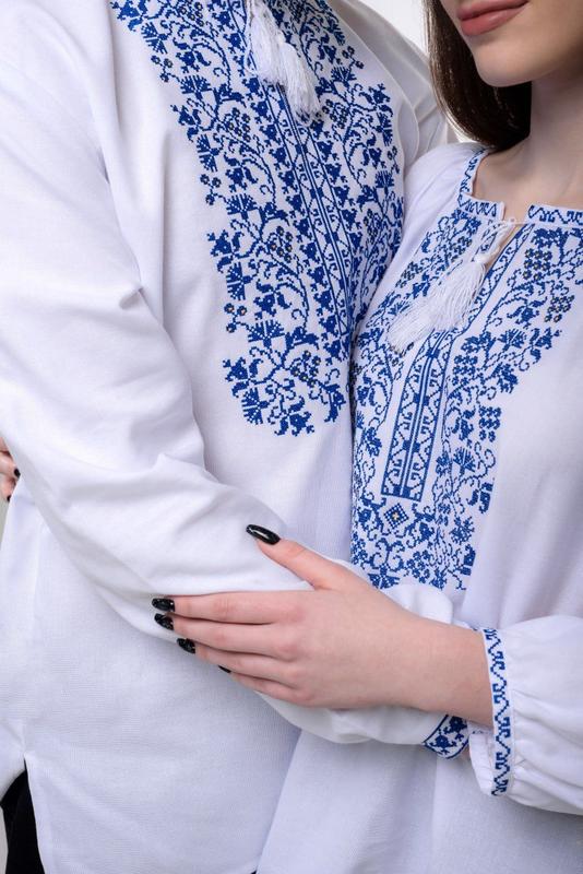 Вышитая мужская рубашка в белом цвете с синим узором. Цвет вышивки может быть серым, красным, синим и голубым Узор размещен на груди и манжетах. Воротник стойкой, горловина с завязками. Тканина: домоткане полотно 48% бавовна, 52% поліестер. Размеры 42-62 От 52 р +150 грн