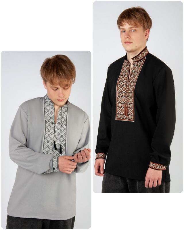 Мужская вышитая рубашка с длинным рукавом выполнена из льняного полотна. Льняная ткань отличается высокой прочностью, отлично впитывает влагу, обладает хорошими свойствами воздухо- и теплопроницаемости, проста в уходе и долговечна в использовании. Данная модель прямого кроя, имеет воротник-стойку, рукава с манжетами на застежке, воротник, манжеты и перед рубашки украшено вышитым орнаментом, сбоку для удобства есть небольшие разрезы. Полотно: лляна тканина Состав: 55% лен, 45% вискоза. Вышитый орнамент: машинная вышивка